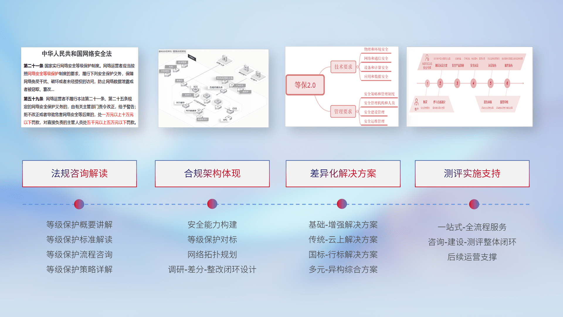 通过专业的法律咨询解读、、、、合规架构体现、、、、差异化解决方案、、测试实施支持等服务,,,为客户量身打造等保合规体系。。。